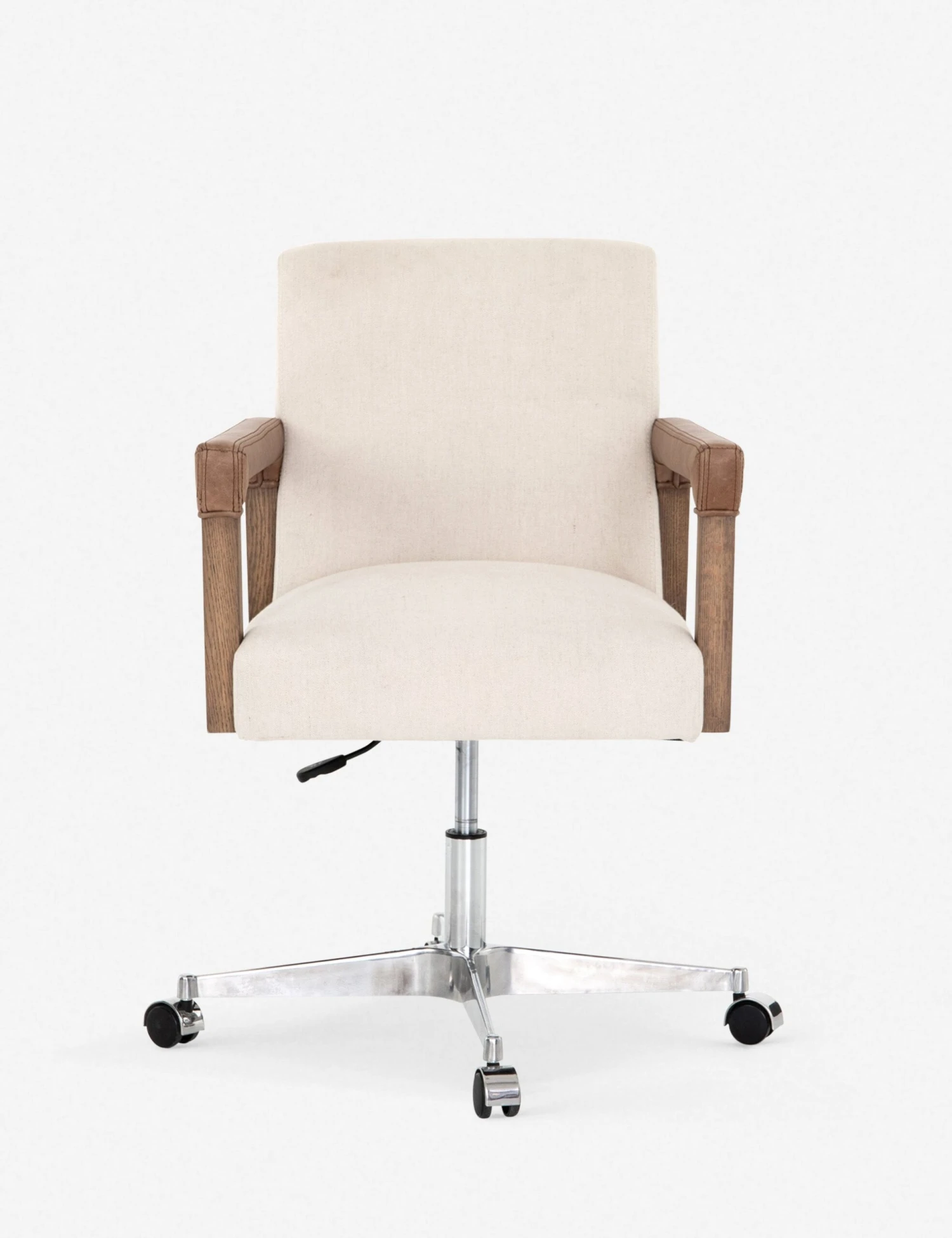 Great for transitional offices, this impressive desk chair contrasts a light neutral upholstery with wooden arms, wrapped in a light-brown leather for a timeless touch.