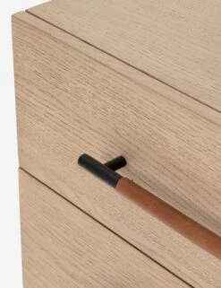 With its clean lines, sandy finish, and leather accents, this dresser brings a refined, minimalist effect to your bedroom. Constructed from solid oak and an oak veneer, it’s complemented by iron hardware and wrapped in tan top-grain leather. Six roomy drawers provide tons of storage space.