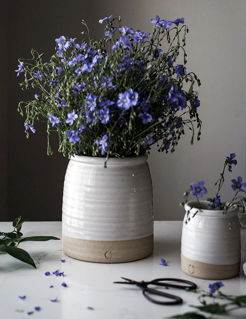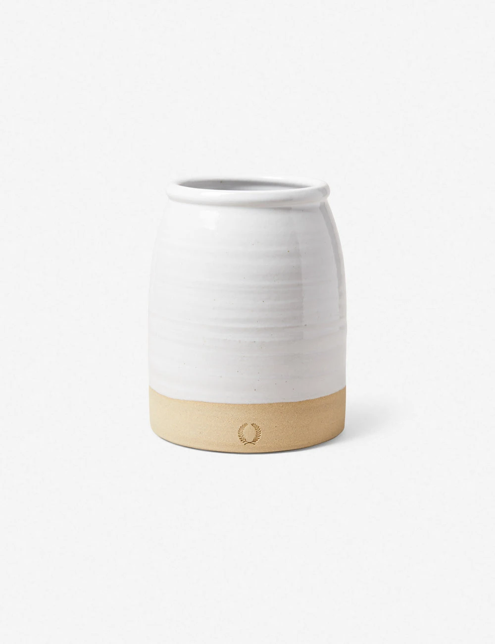 Vermont-based studio Farmhouse Pottery creates handcrafted accents and table essentials with rustic charm. A classic silhouette showcases artisanal appeal of this stoneware crock. From corralling essential utensils to offering a fresh floral display on your counter or table, this container brings a practical, timeless touch to a kitchen.