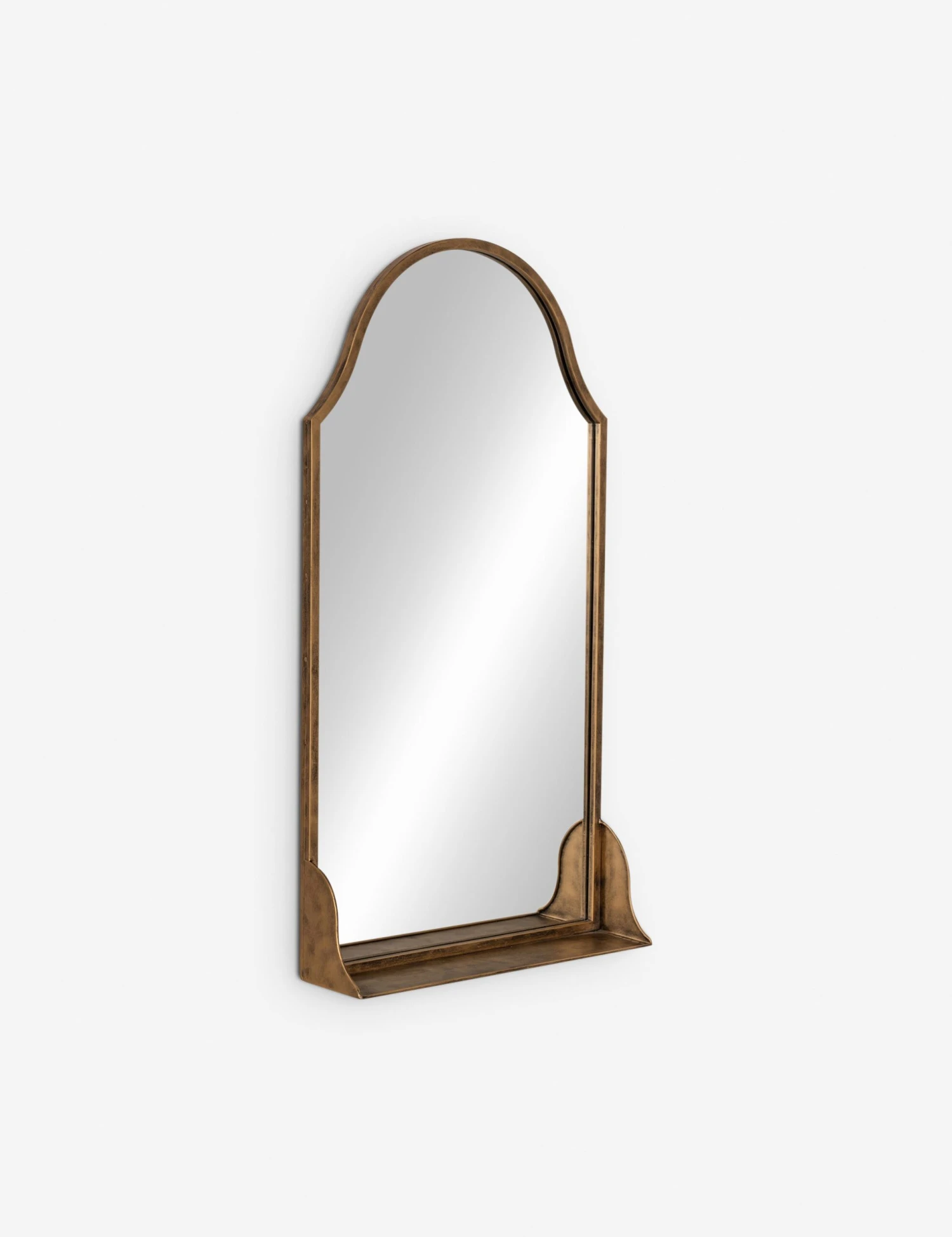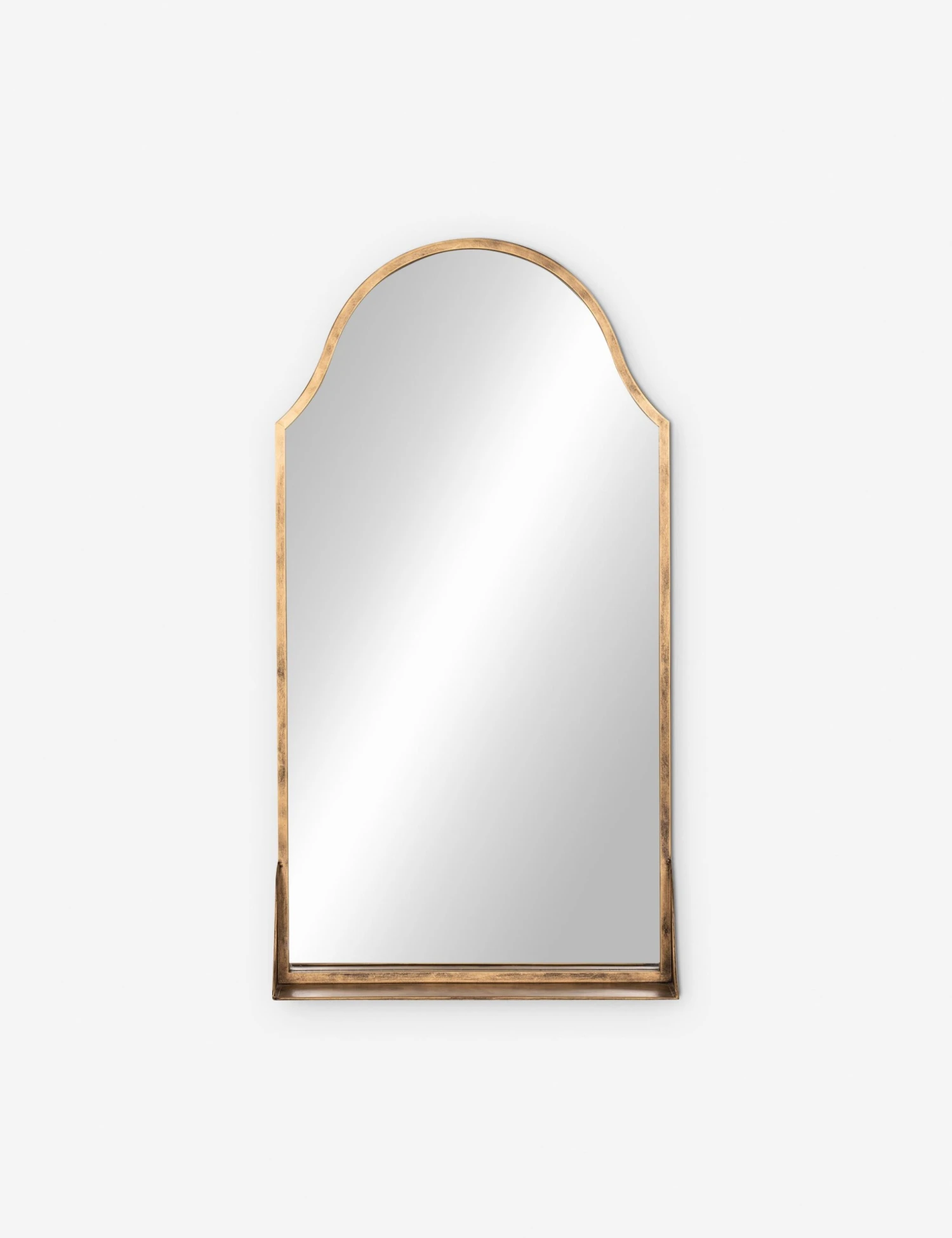 A functional and stylish addition to your space, this arched wall mirror features a distressed metal frame with a built-in shelf — perfect for narrow entryways and bathrooms!