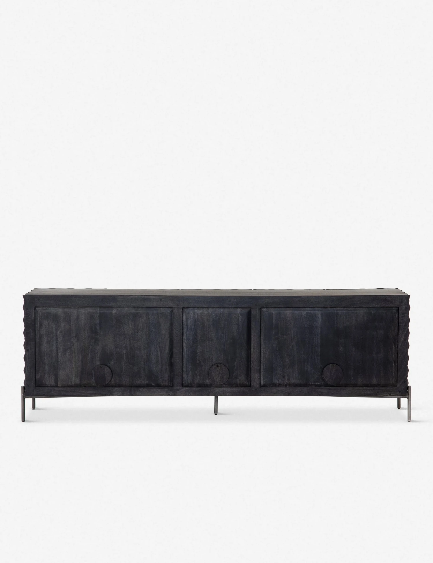 A truly modern piece that will be the focal point of your media room, this wooden console’s unique carved design adds geometric texture in a sleek black wash. Sits on a minimalist iron base.