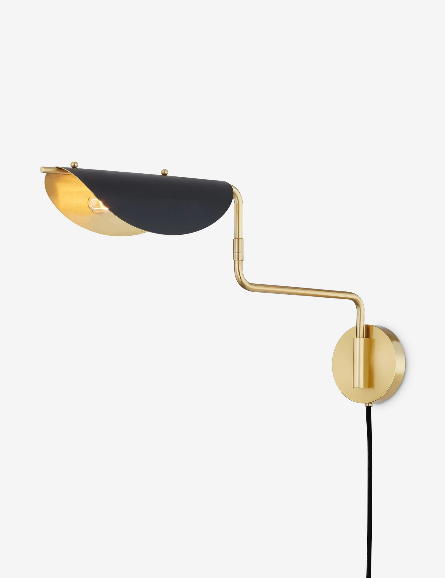 Task lighting should offer a seamless blend of function and formโthe Eugene sconce does it with style. The sleek metal shade drapes over the adjustable arm to reflect light down, making this plug-in sconce a brilliant reading light whether styled by your bedside or in a home office or lounge. The arm pivots at two points, allowing you to direct light wherever needed.