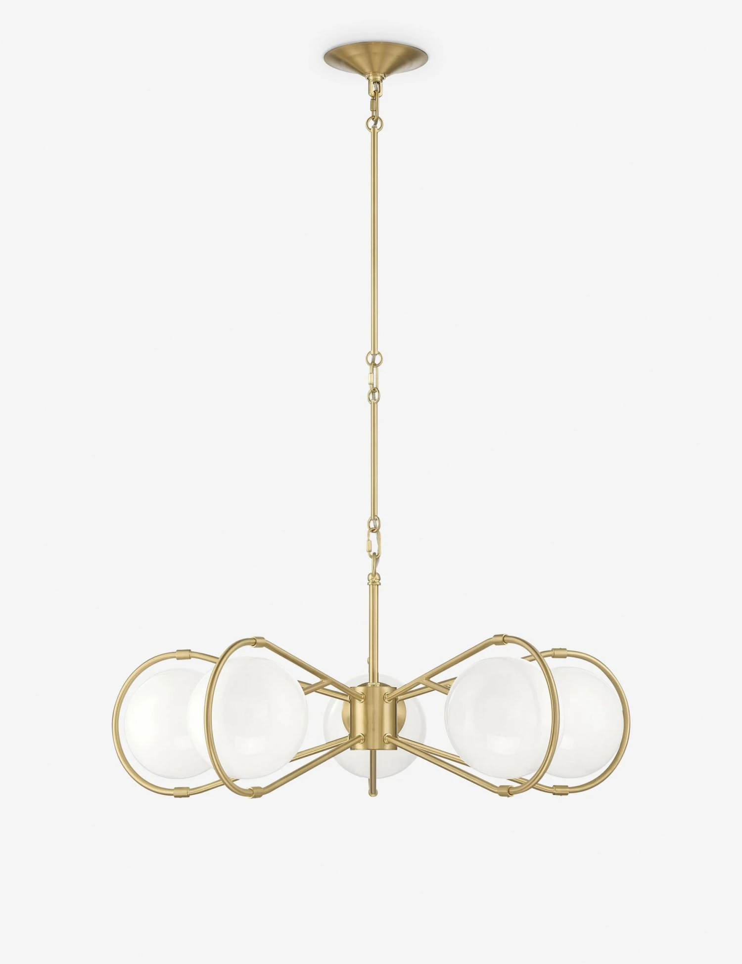 Create signature appeal overhead with this distinctive chandelier design. Five looping arms hold white glass globes, offering mid-century charm with a touch of glamour. This chandelier is the perfect size for most dining tables or a mid-sized lounge.