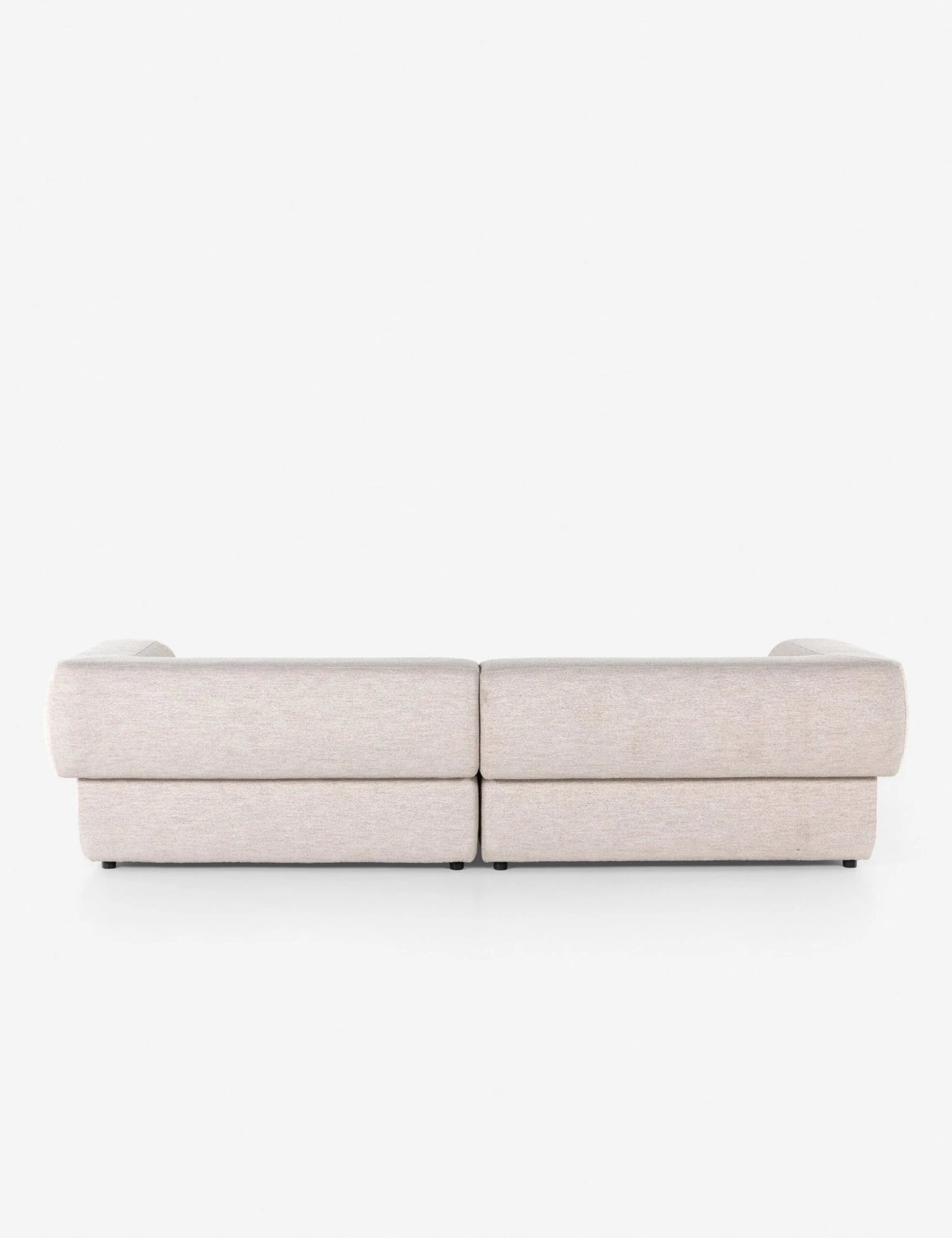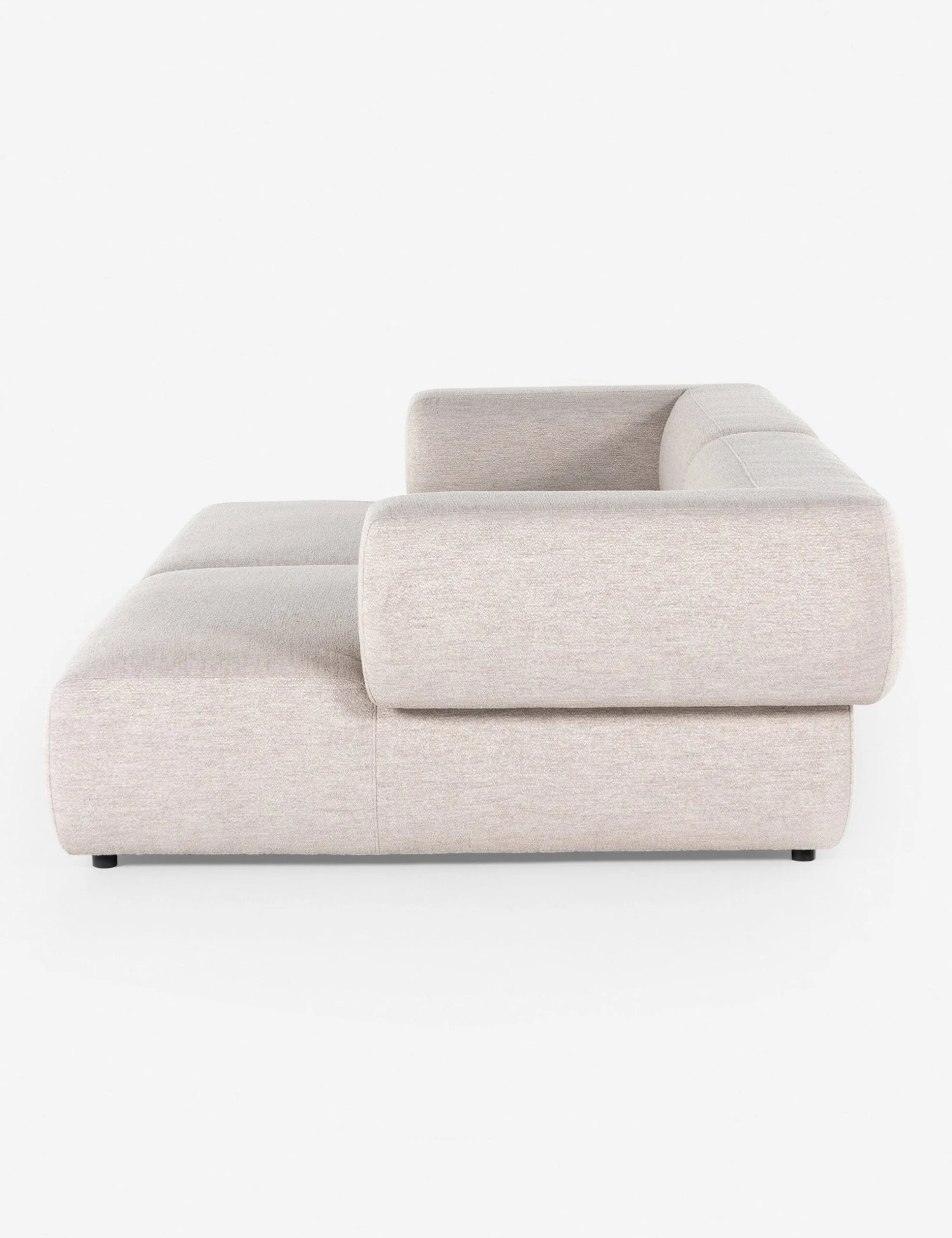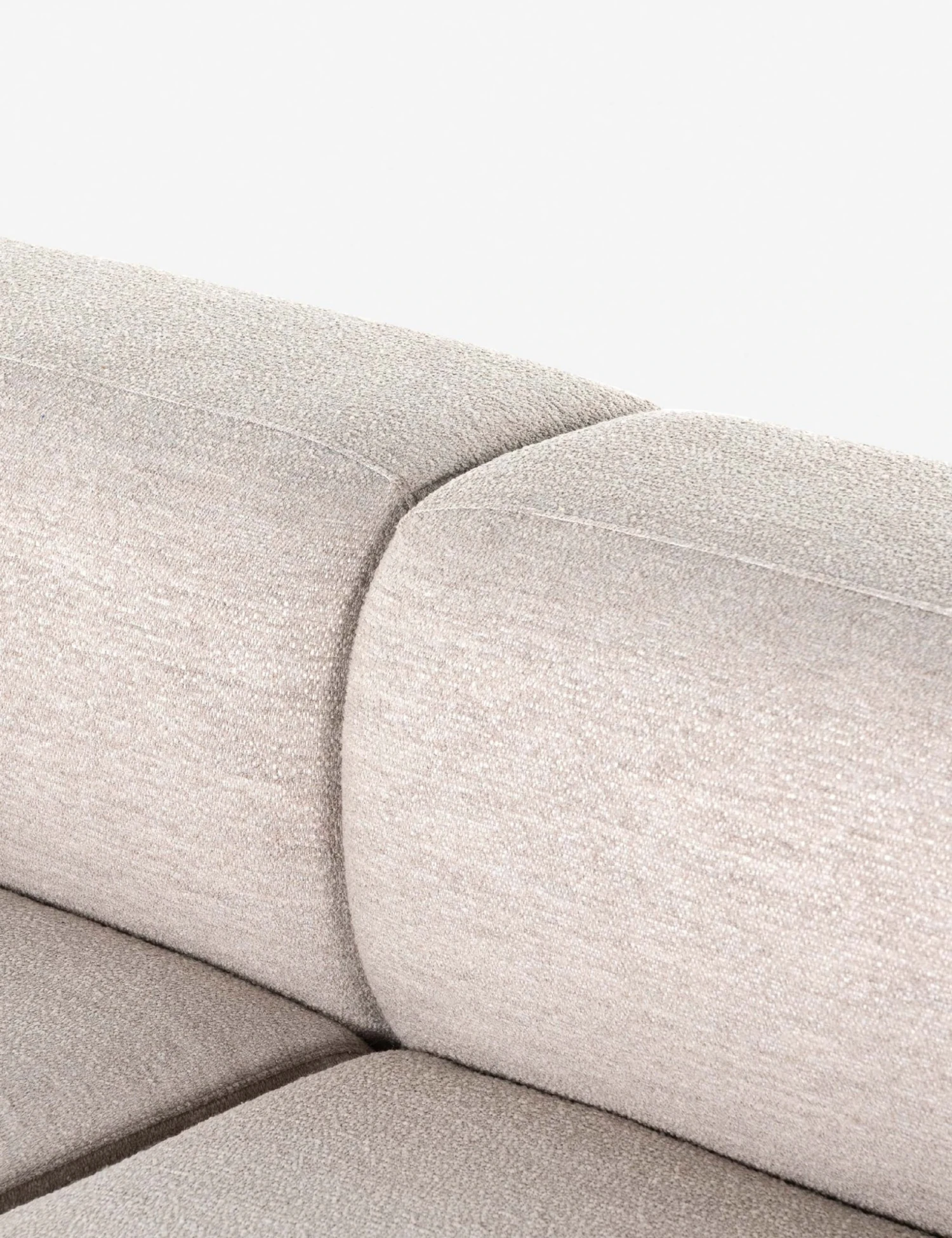 A plush tailored design wrapped in high-performance fabric with a softness resembling a blend of boucle and linen makes this sectional sofa a refined touch of modern comfort. A deep chaise seat design lends this sectional an inviting, relaxed profile to lounge on. Style with natural textures and organic accents for a cozy California feel.