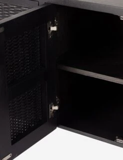 The Isaura media console offers textural impact in black. Its cane-paneled cabinets and drawers provide versatile storage solutions with cutouts behind for cord management. The dowel legs stand apart from the case, framing this console with an artful bearing.