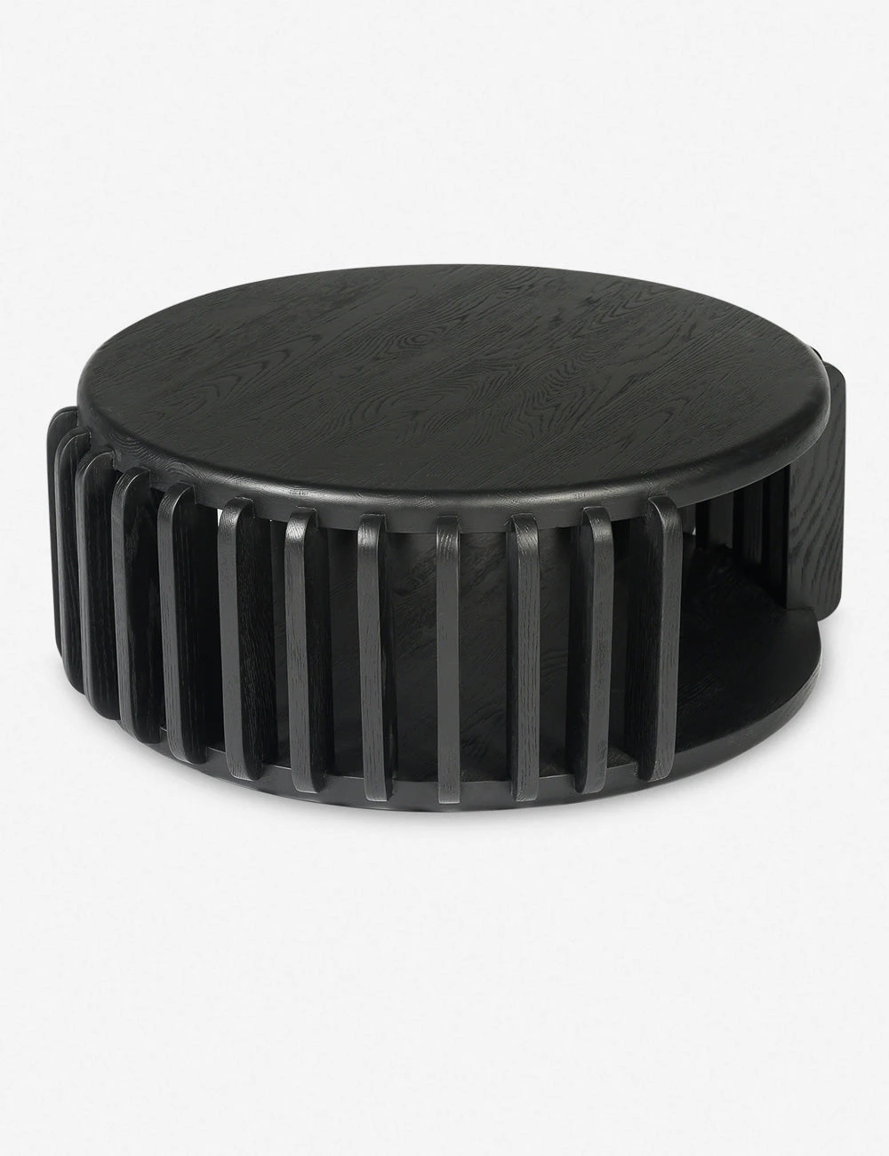 Solid oak gets a sculptural treatment in this modern coffee table. The round slatted design creates an airy profile with an opening for storage or decor. With its soft lines and natural grain appeal, this wood coffee table offers a statement-making centerpiece for a refined aesthetic.
