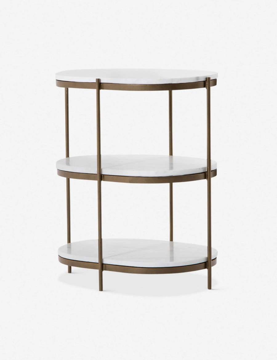 Boasting both vintage-inspired charm and a dose of modern luxury, this three-tiered nightstand is the perfect finishing touch to your feminine-chic bedroom. While the brass-finished iron has an industrial look, white marble and soft oval-shaped shelves soften the look for a stunning storage piece you’ll love!