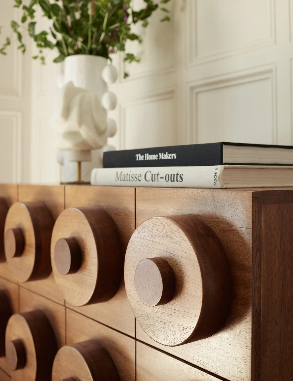 Cylindrical wood drawer pulls clad this dresser with a playful facade for an effortlessly modern feel. We love the compact length and spacious drawers for an eye-catching dresser with small-space potential.