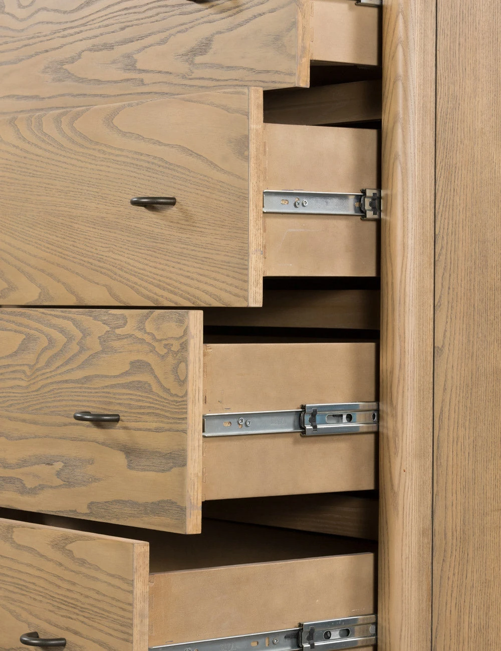 A clean-cut, ash wood design brings Danish-inspired warmth to this Laird dresser. Iron arch pulls complete the look, while the woven cord shelf offers the perfect textural touch. With five spacious drawers, this tall dresser will fashion your bedroom with ample storage and natural grain appealรขโฌโplus, the lower open shelf is great for baskets or bins.