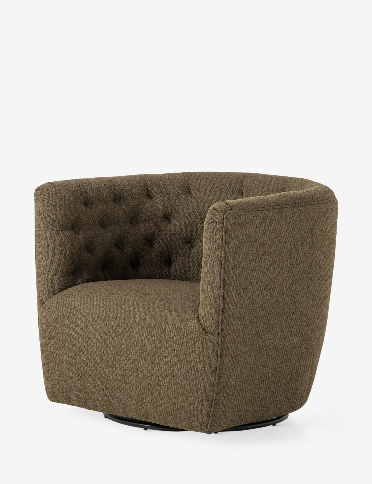 The traditional barrel chair gets a modern twist in this irresistibly stylish design. All-over upholstery and a tufted seat evoke a classic tone, while the shapely silhouette and swivel base fashion this accent chair with a chic edge. We love this piece for a cozy reading nook or timeless lounge.