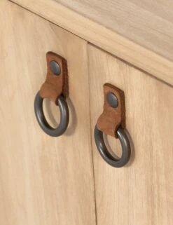 Simply inspired, this solid dry-washed poplar media console combines clean lines with dovetail joints in a Shaker-inspired design. This console is finished in a light neutral tone and fitted with iron and leather hardware and rear cutouts for functional bliss in a versatile, understated style.