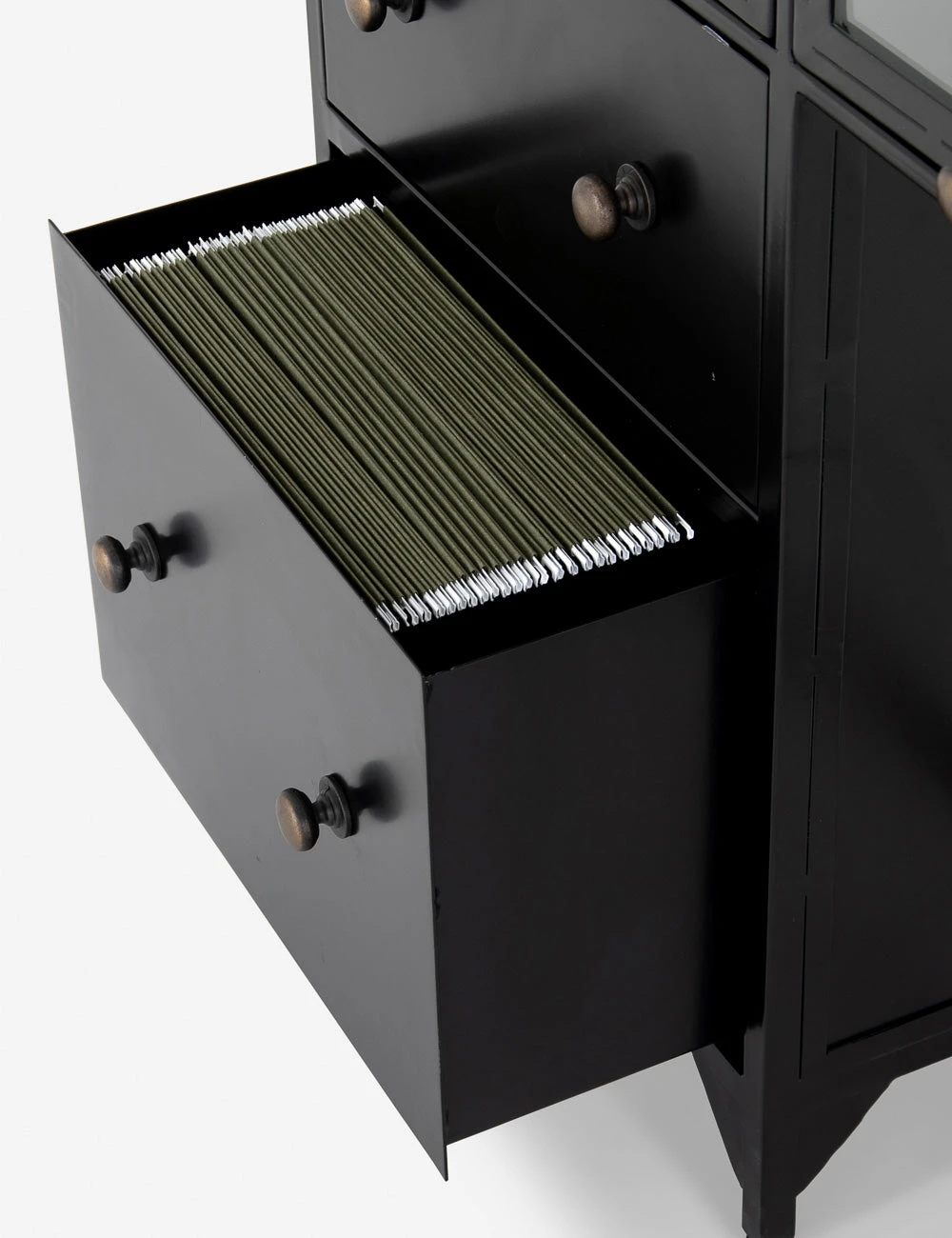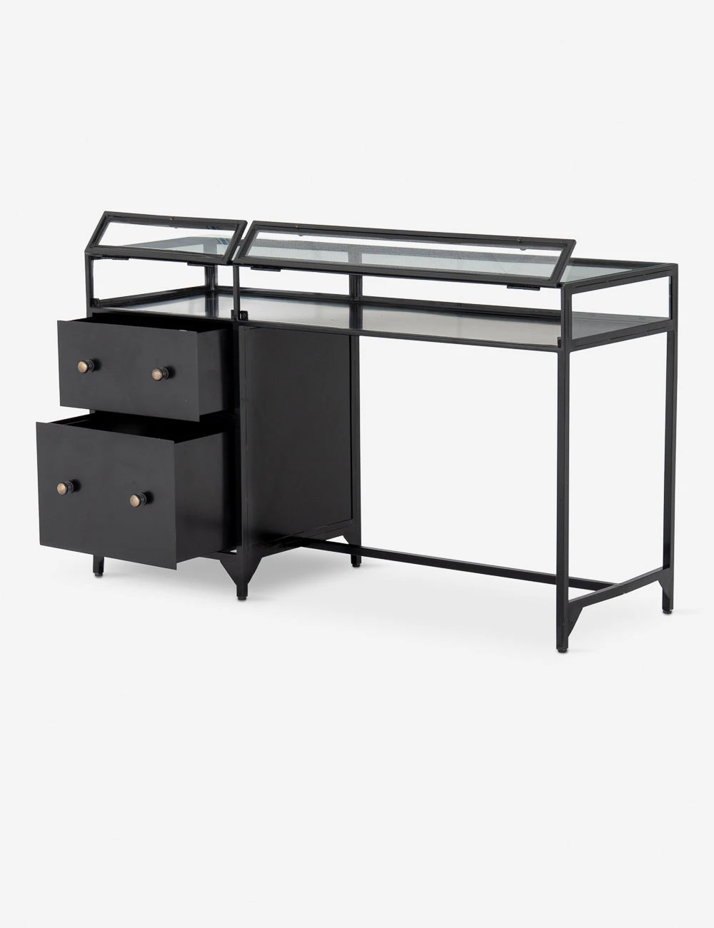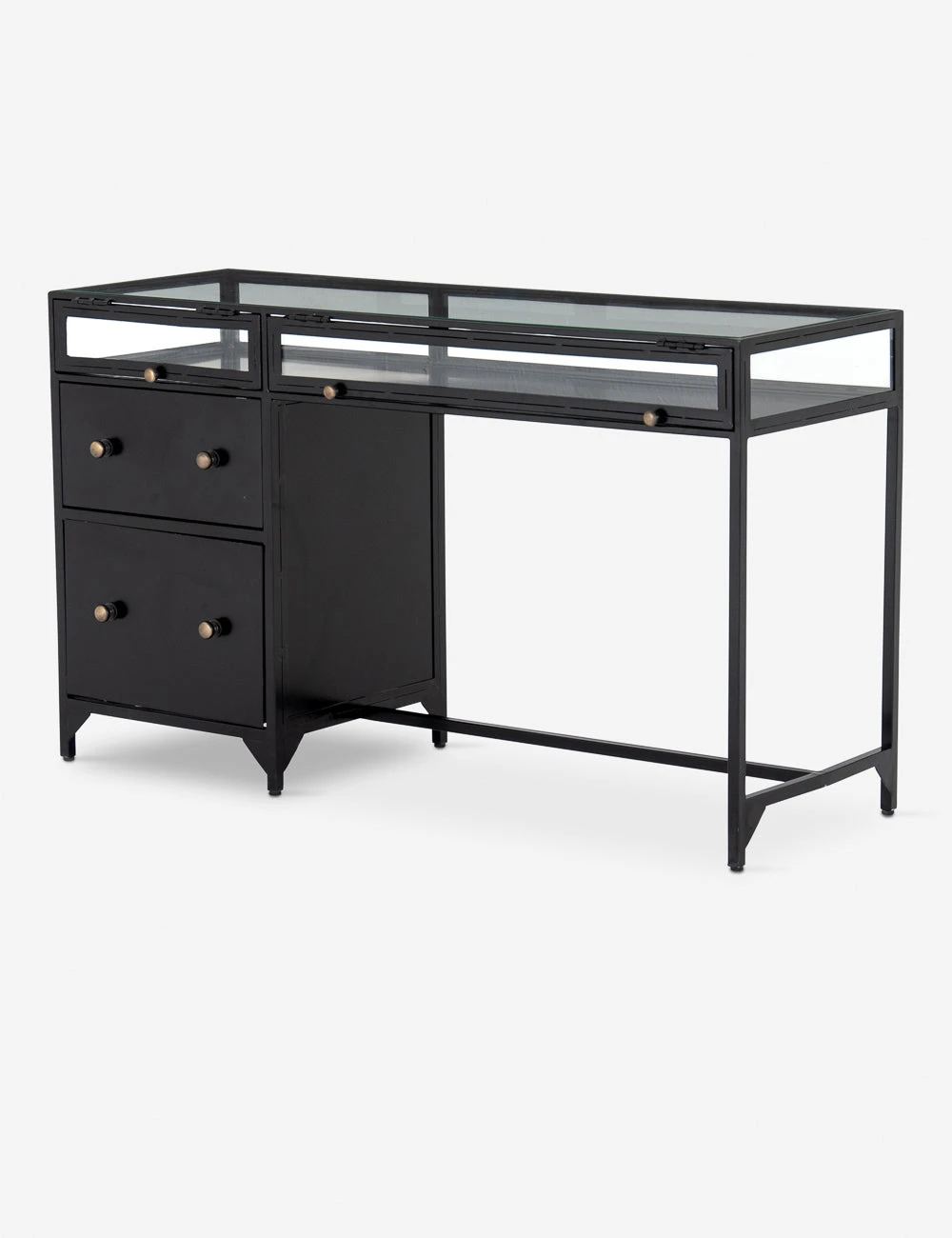 In a sleek nod to a shadow box design, this desk features an iron frame with glass enclosures for storage and display. The Malcom Desk includes a file drawer finished and brass knobs to offer a practical touch with an industrial edge.
