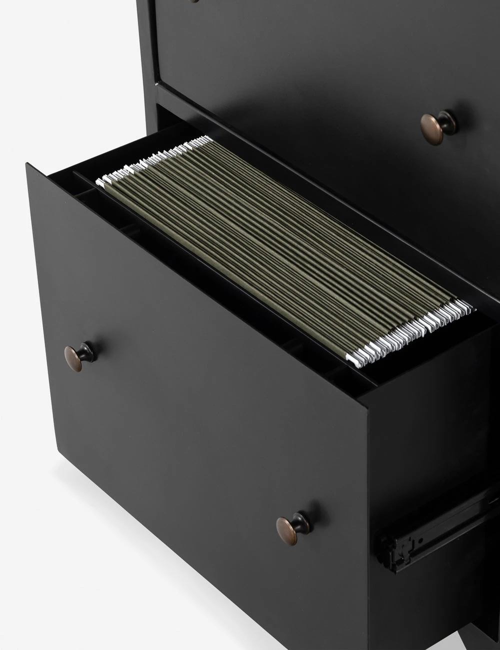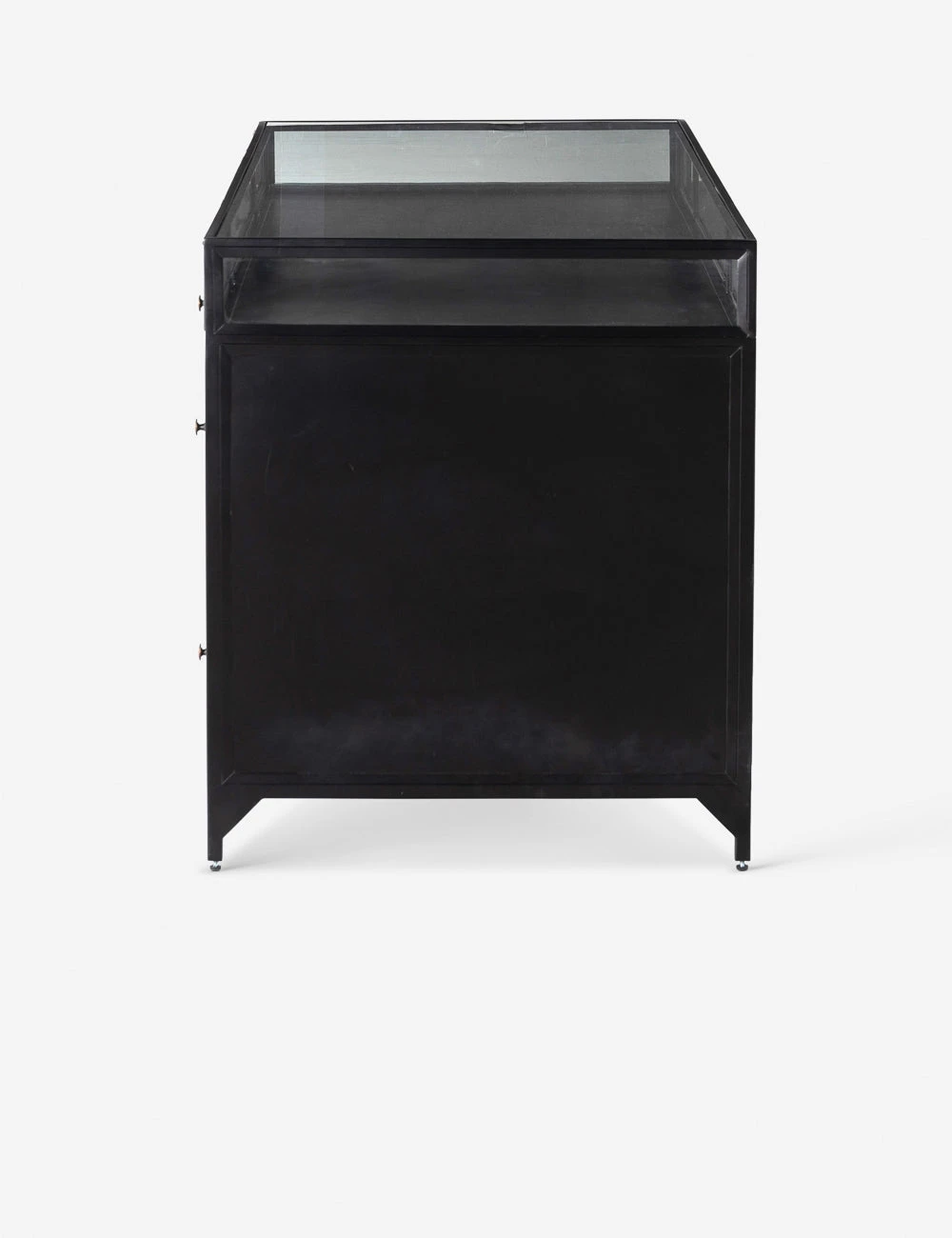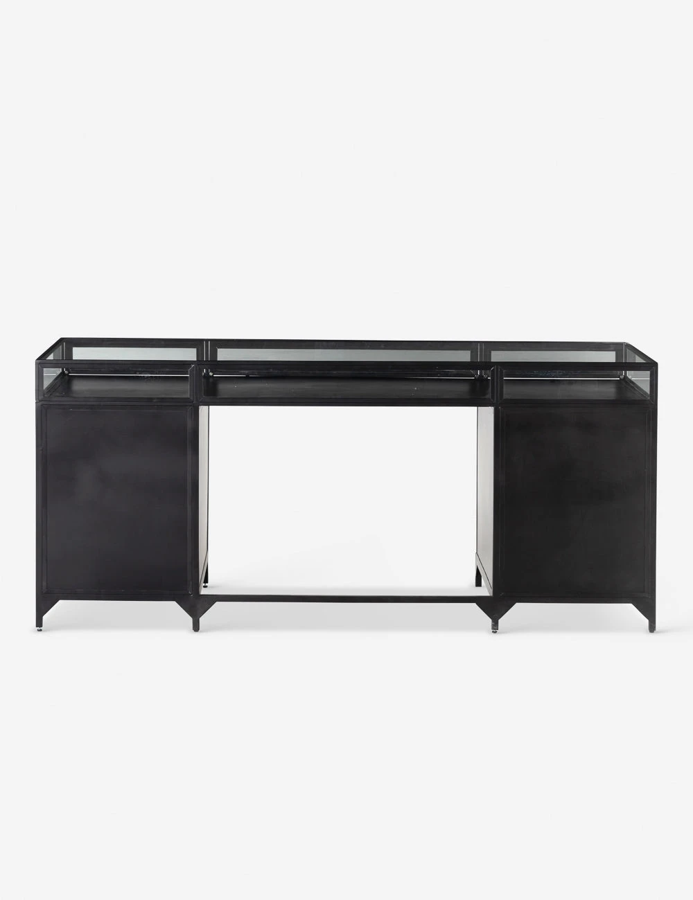 In a sleek nod to a shadow box design, this desk features an iron frame with glass enclosures for storage and display. The Malcom Executive Desk includes file drawers finished and brass knobs to offer a practical touch with an industrial edge.