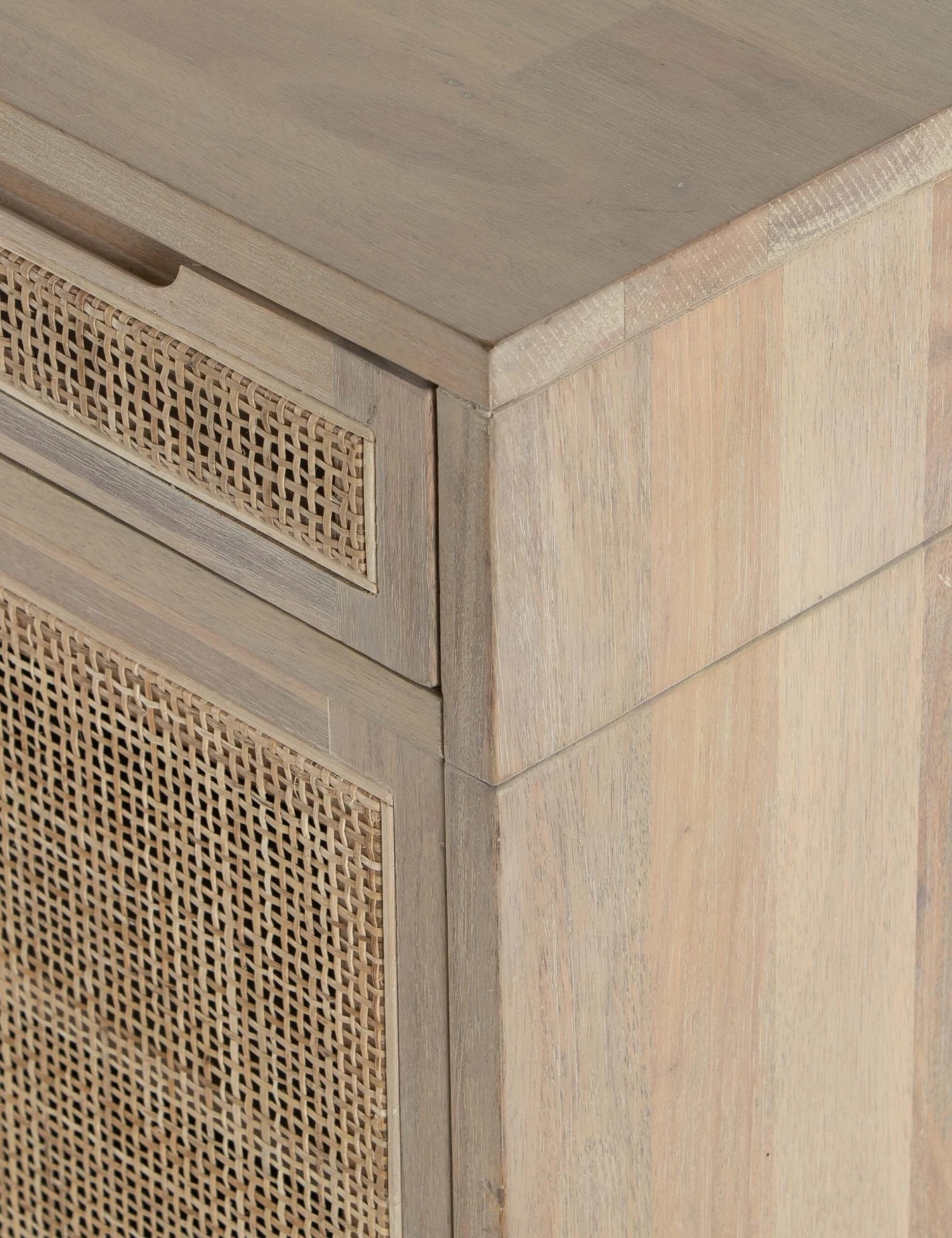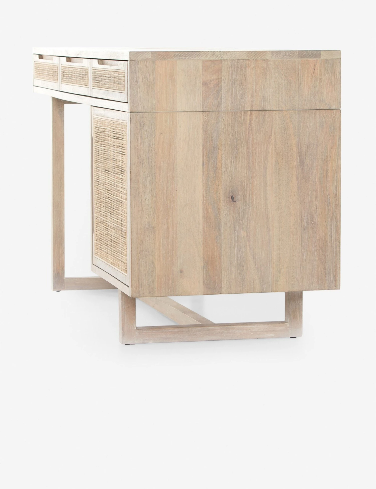 A timeless, clean-lined silhouette is elevated by detail-rich wood grain and woven cane fronts to create this Margot Desk. Crafted from natural mango wood, its whitewashed finish complements the three cane pencil drawers and a cabinet door for a tonal storage piece. Immediately transform your home office with this workstation.