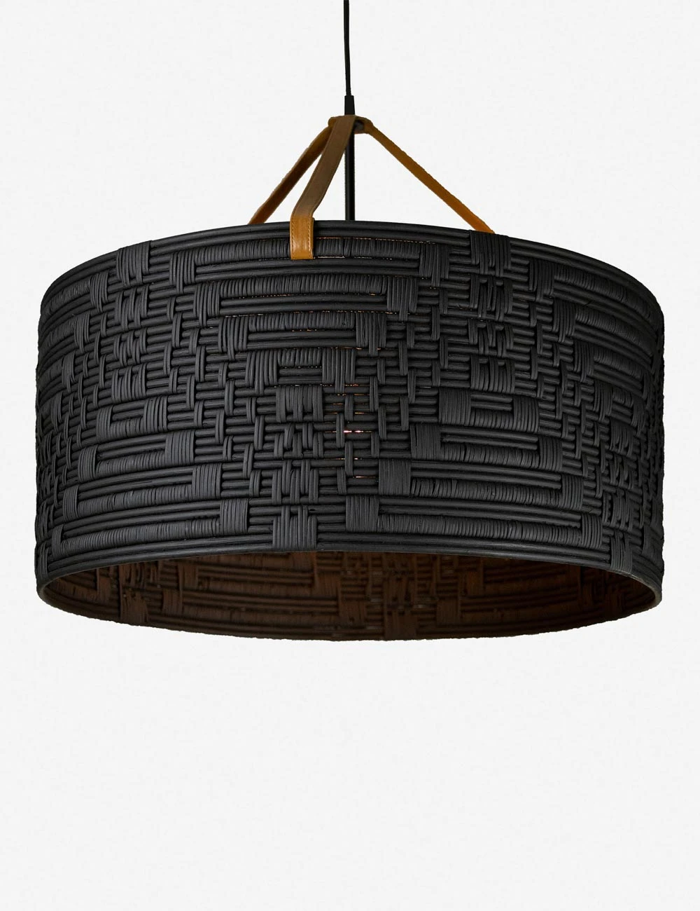 Inspired by Italian basket weaving techniques, this modern chandelier features a rattan drum shade suspended by leather straps. The intricate, handwoven pattern offers endless artisan craftsmanship in a large chandelier design that blends dynamic style with natural textures.