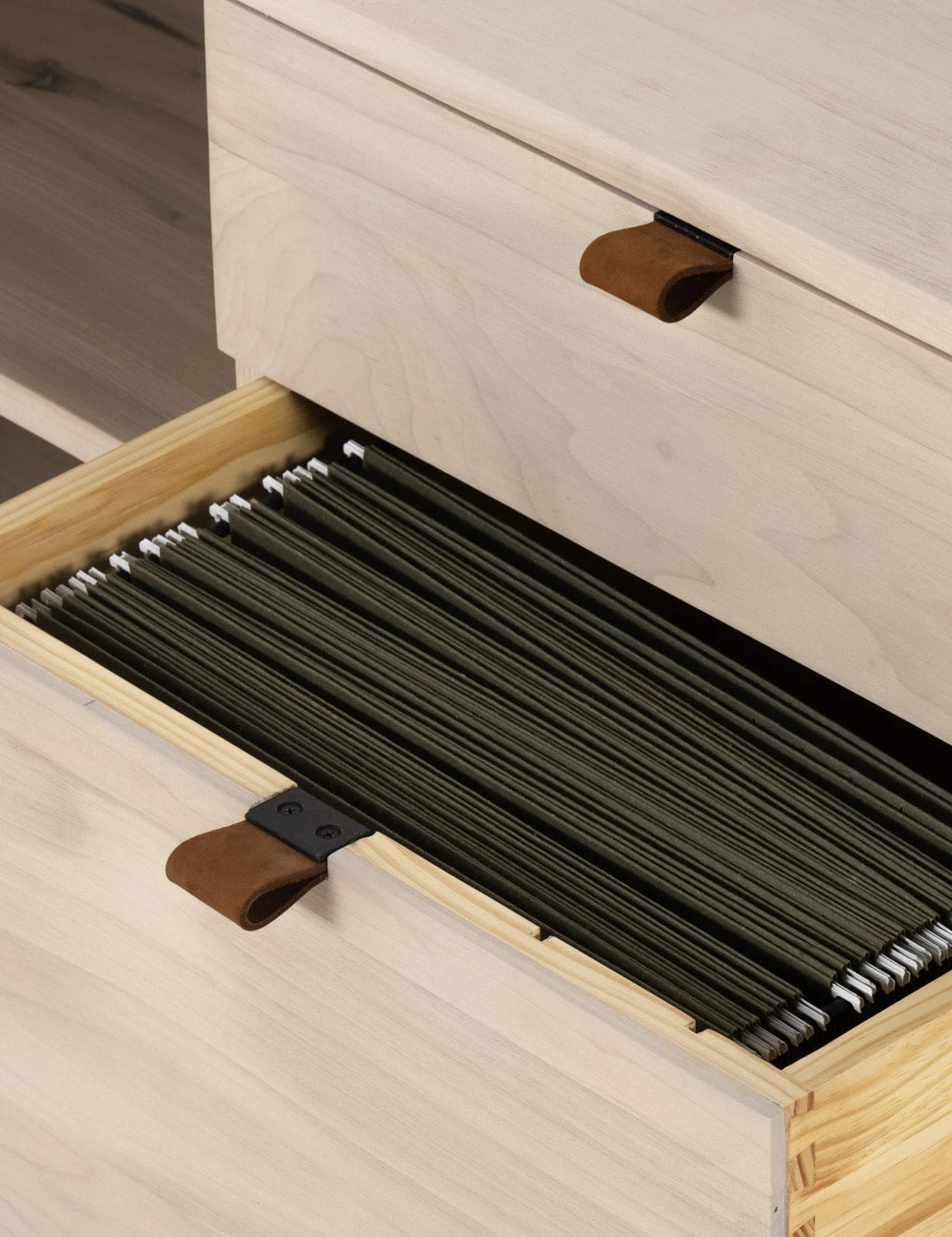 Keep your office style grounded (and super organized) with this wooden filing console. Features elements of mid-century aesthetics like a black wash, slim iron base, and top-grain leather drawer pulls.
