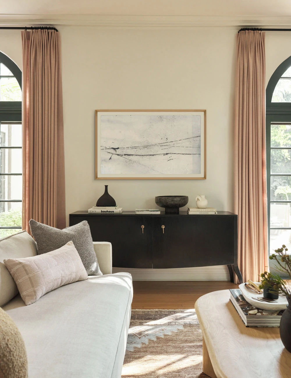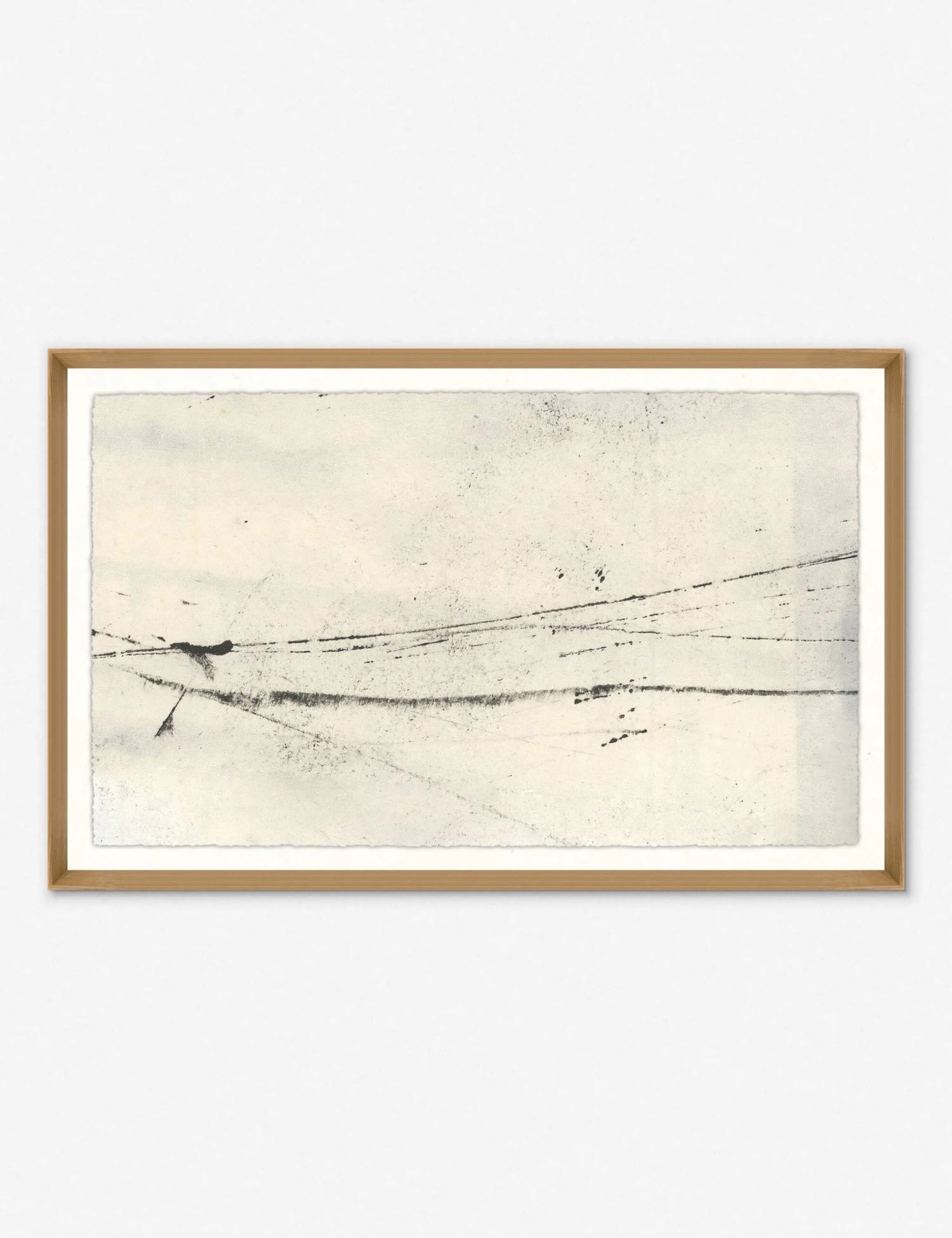 A dream piece for minimalistic and mid-century spaces, this delicate wall art uses linear elements and brushstrokes to create subtle perspective and texture. Mounted in a wooden frame.