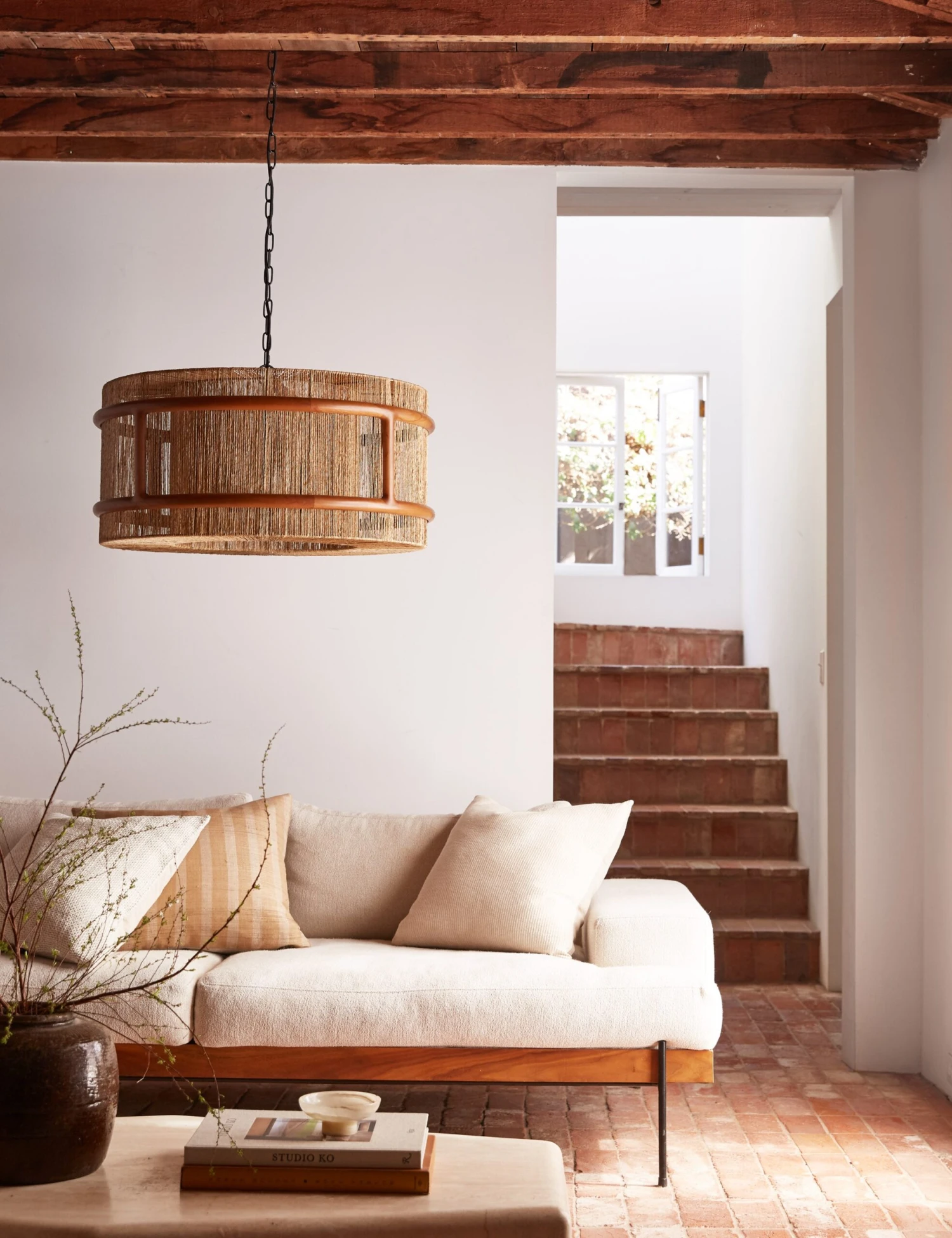 Add some texture to your edit with woven lighting. The Suma chandelier features a jute shade bound in a sculptural beechwood frame, bringing organic warmth to the room. This chandelier design is the perfect statement light for a space where modern touches and rustic elements blend together in a grounded curation.
