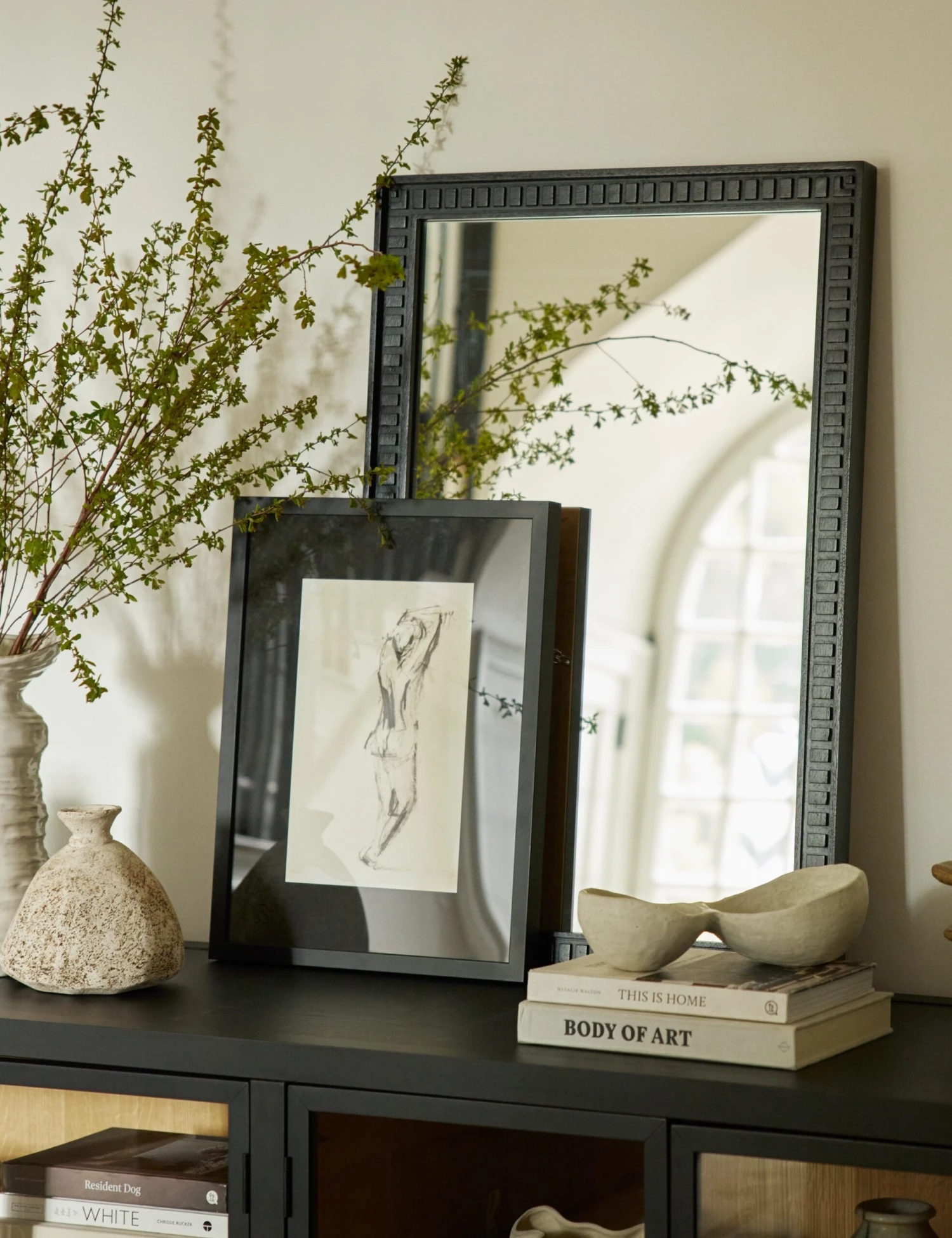 Add a touch of character to your wall decor with the Thelma mirror. The carved wood frame provides a rustic look that never goes out of style. Plus, in a versatile dark finish, this decorative mirror can fold into a layered, moody aesthetic or offer a touch of contrast to a bright and airy space.
