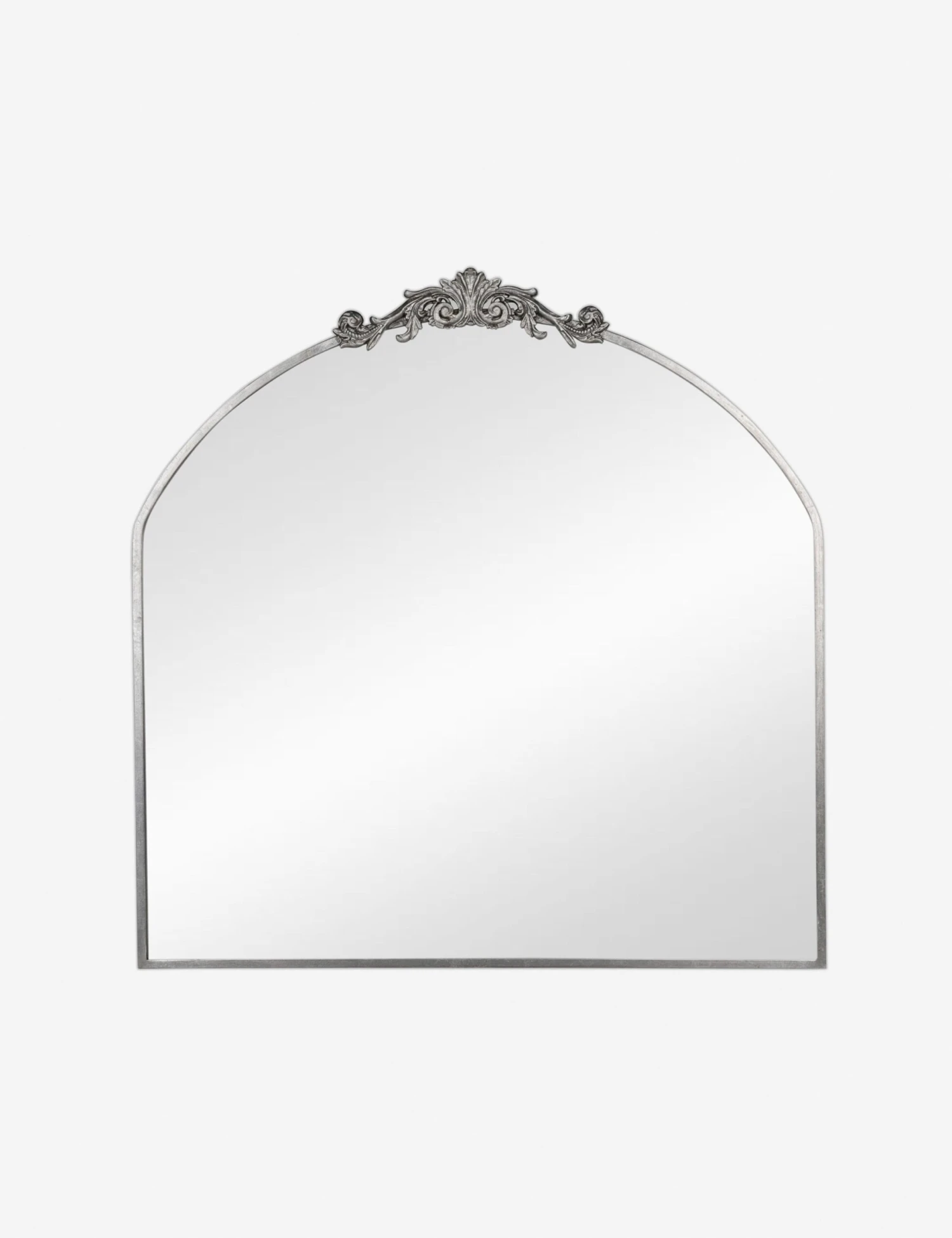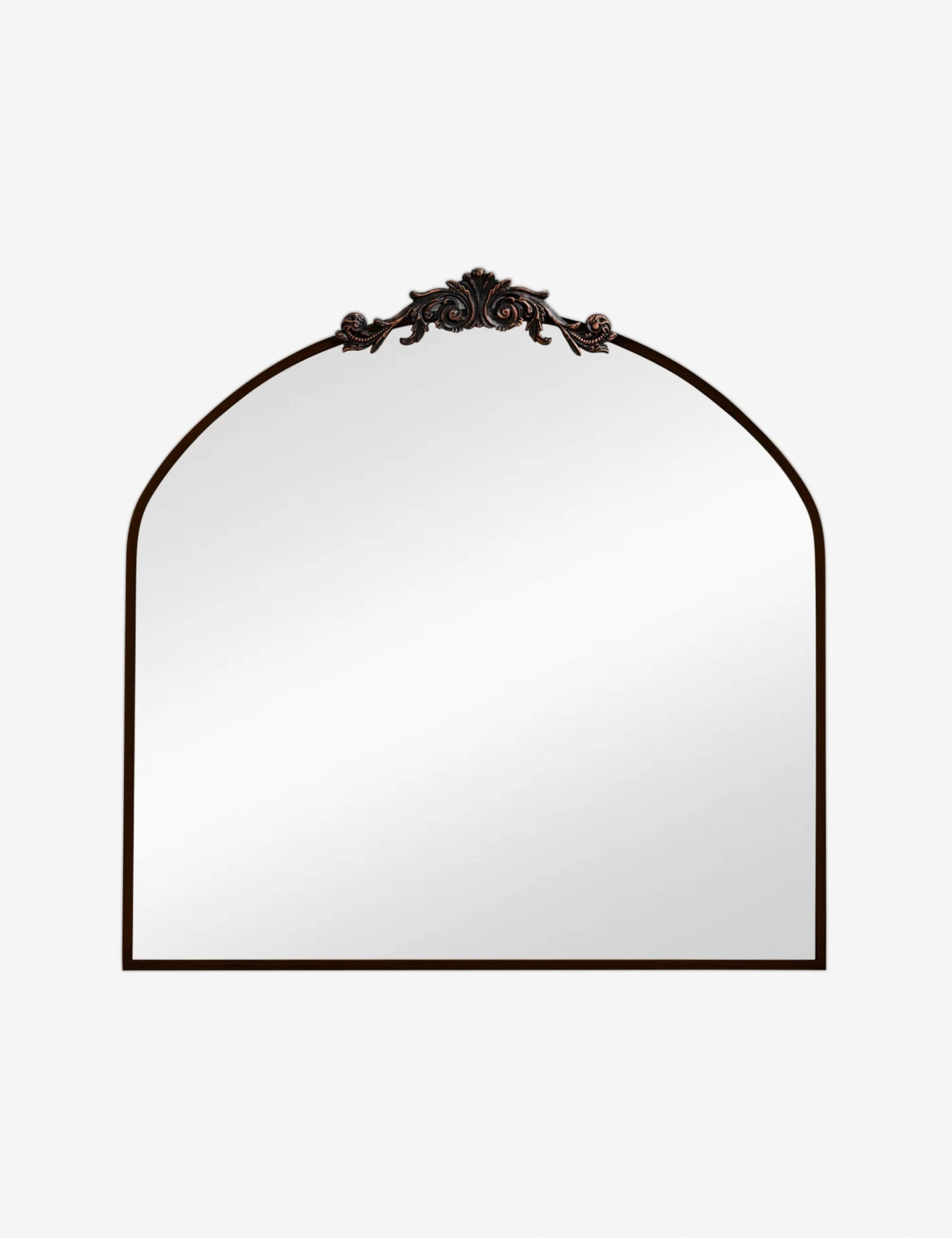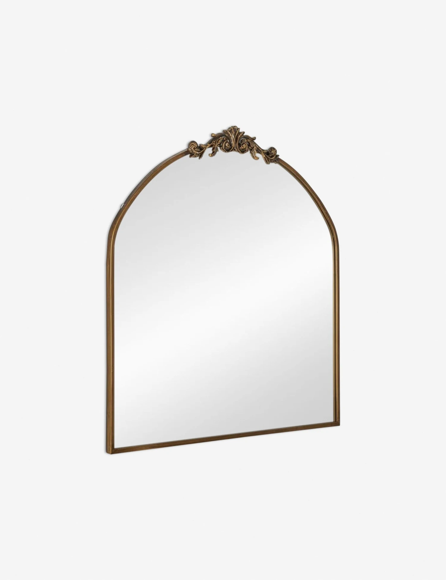 A large wall mirror with impressive style. This curved mirror features a flat bottom edge and traditional scroll detailing at the apex of the metal frame, making it the perfect vintage-inspired accent piece hung above a hallway console table, or above a bedroom dresser.