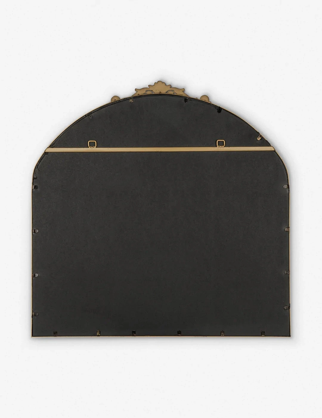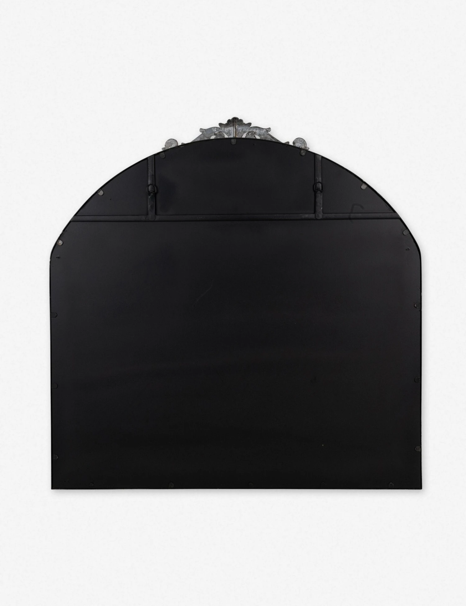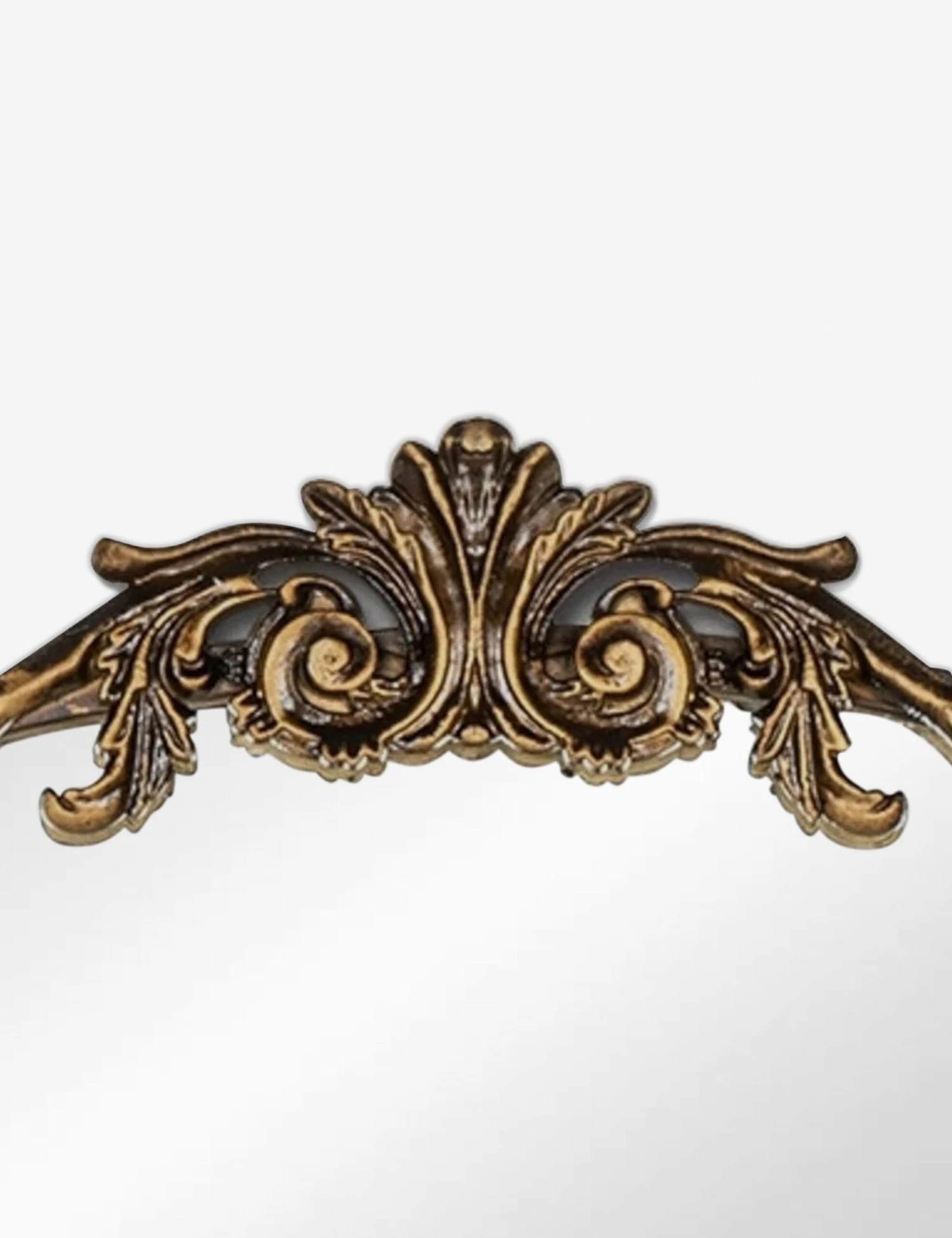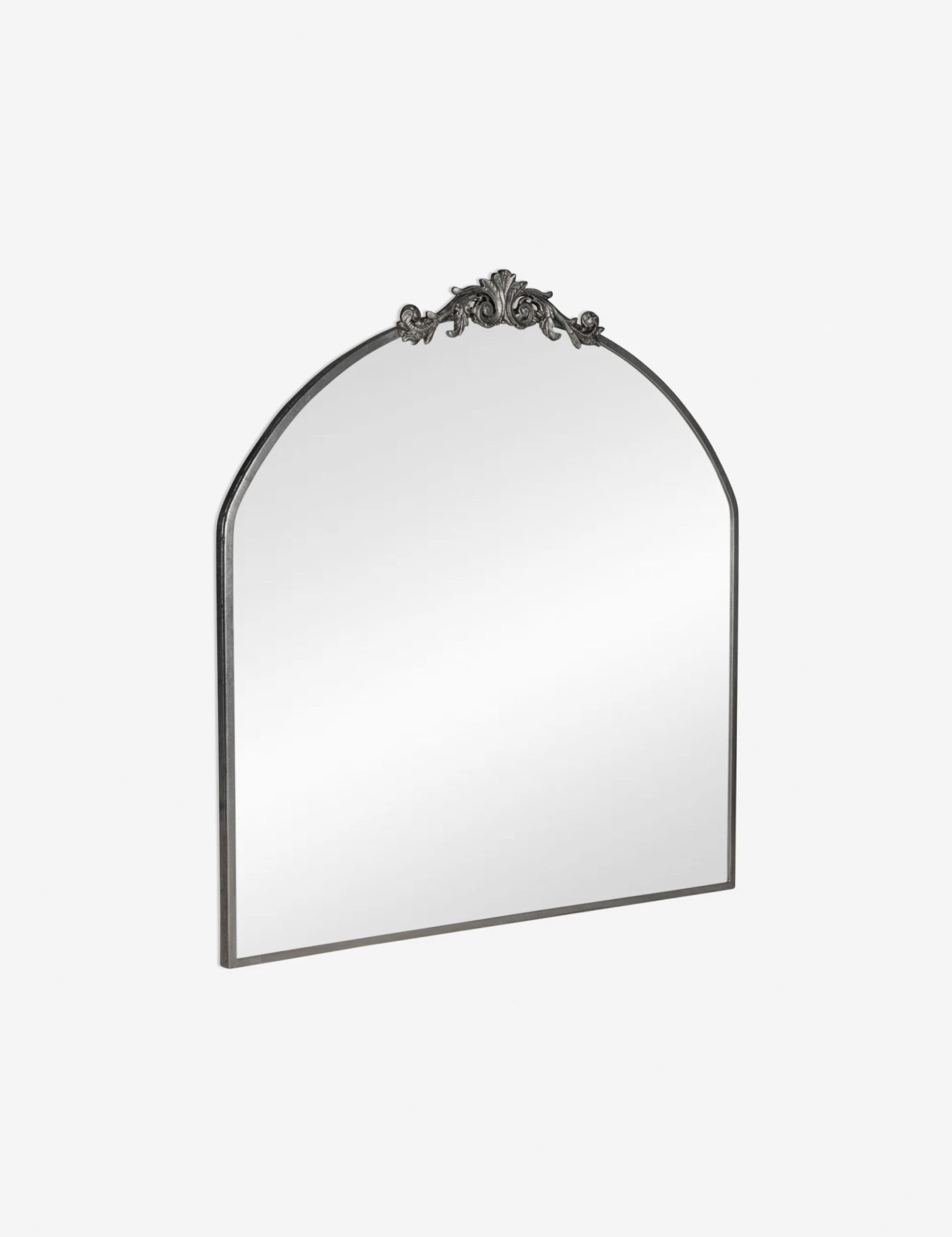 A large wall mirror with impressive style. This curved mirror features a flat bottom edge and traditional scroll detailing at the apex of the metal frame, making it the perfect vintage-inspired accent piece hung above a hallway console table, or above a bedroom dresser.