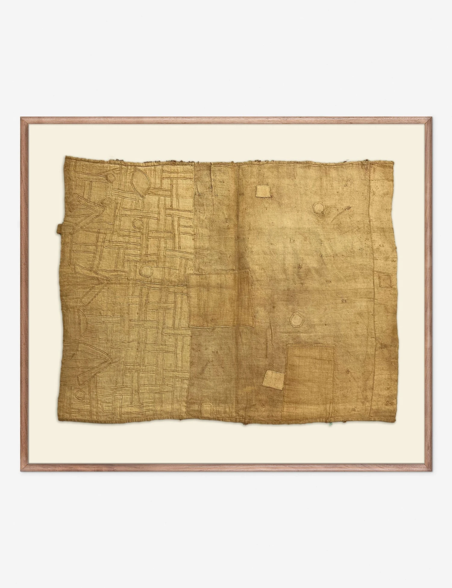 Bring a singular touch to your wall decor with this one-of-a-kind cloth from Congo. The word Kuba means lighting and refers to the blades once used by Kuba warriors. Each cloth is handcrafted using traditional techniques—first woven on a small loom, then embroidered with their tactile design—before being floated in a walnut frame for a truly unique piece of textile wall art.