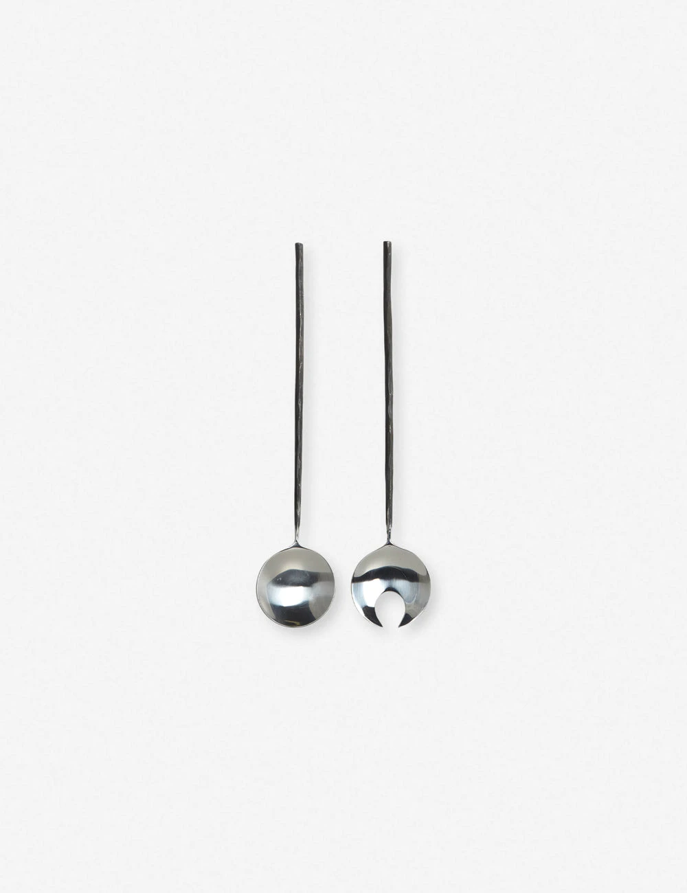 Elevate your next meal with this stunning salad server set. The stainless steel spoon and fork are dishwasher-safe for everyday use and share a unique silhouette with textural handles for a rustic touch—a clean, essential design for your fresh essential greens.